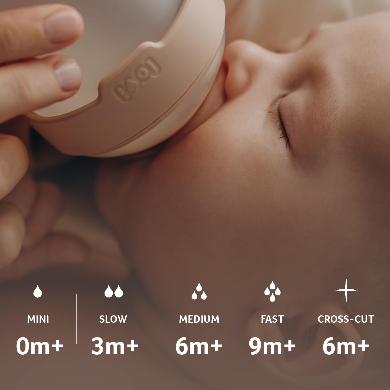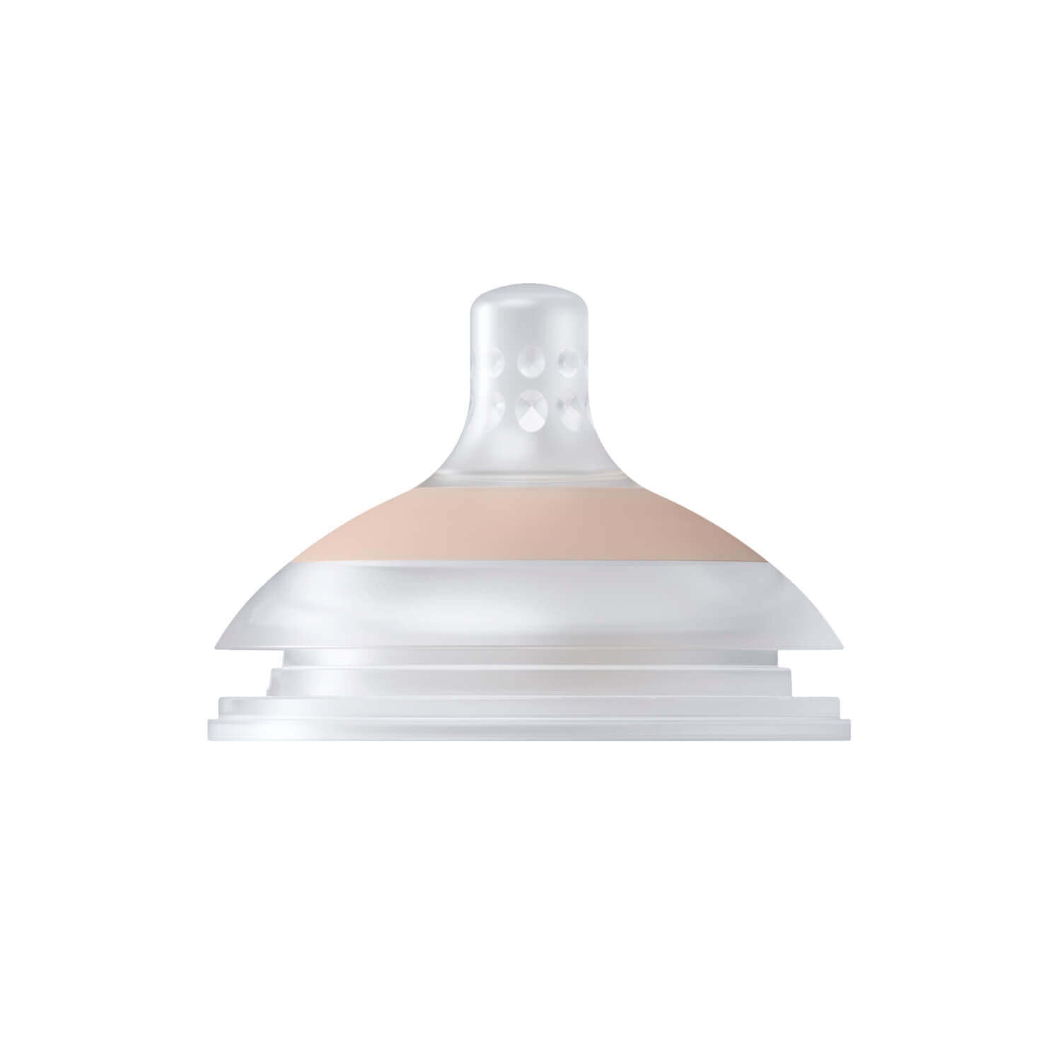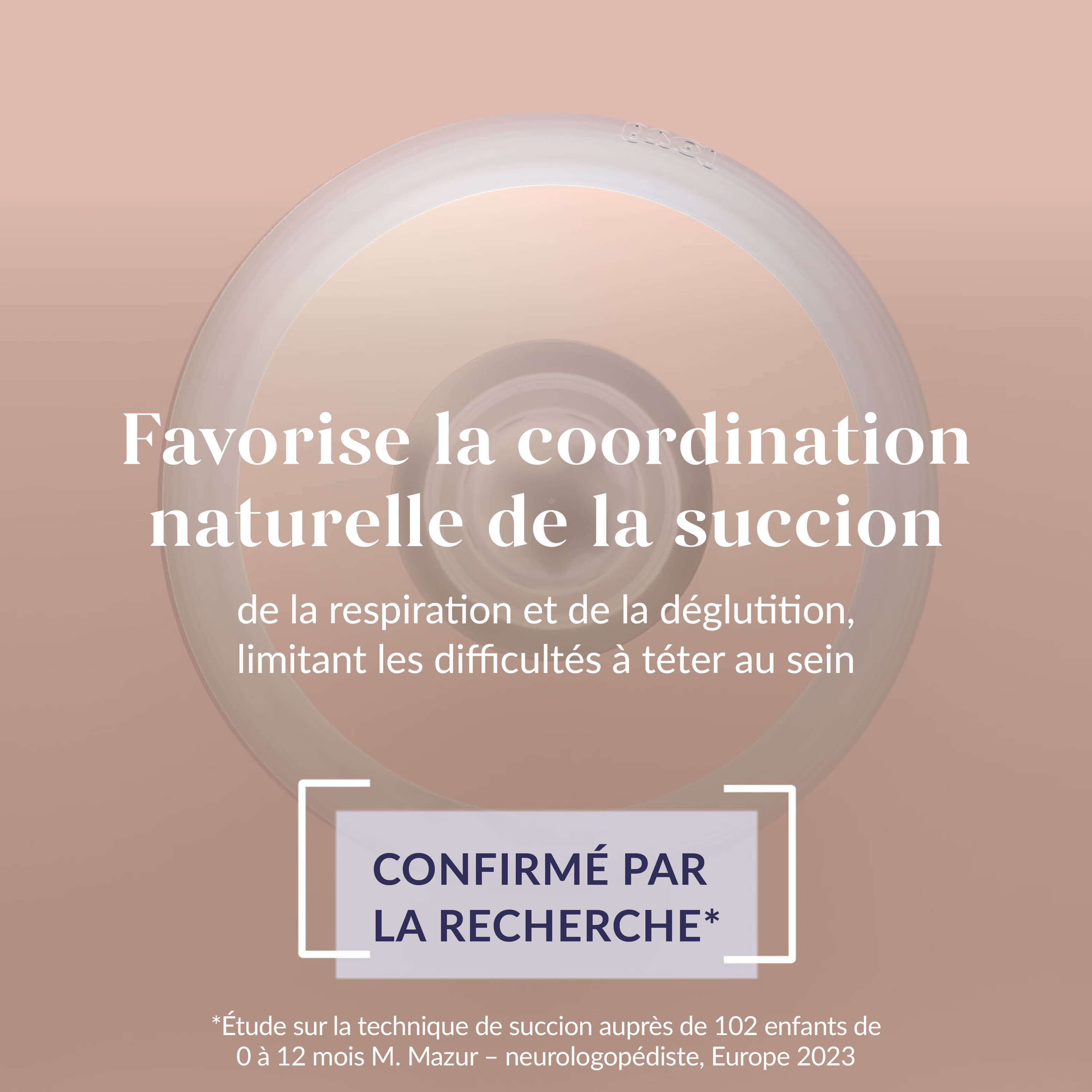 L'anneau de la tétine est exceptionnellement doux, reproduisant la peau et la texture de l'aréole. Sa surface mate offre une prise confortable et améliore l'expérience pour le bébé.
