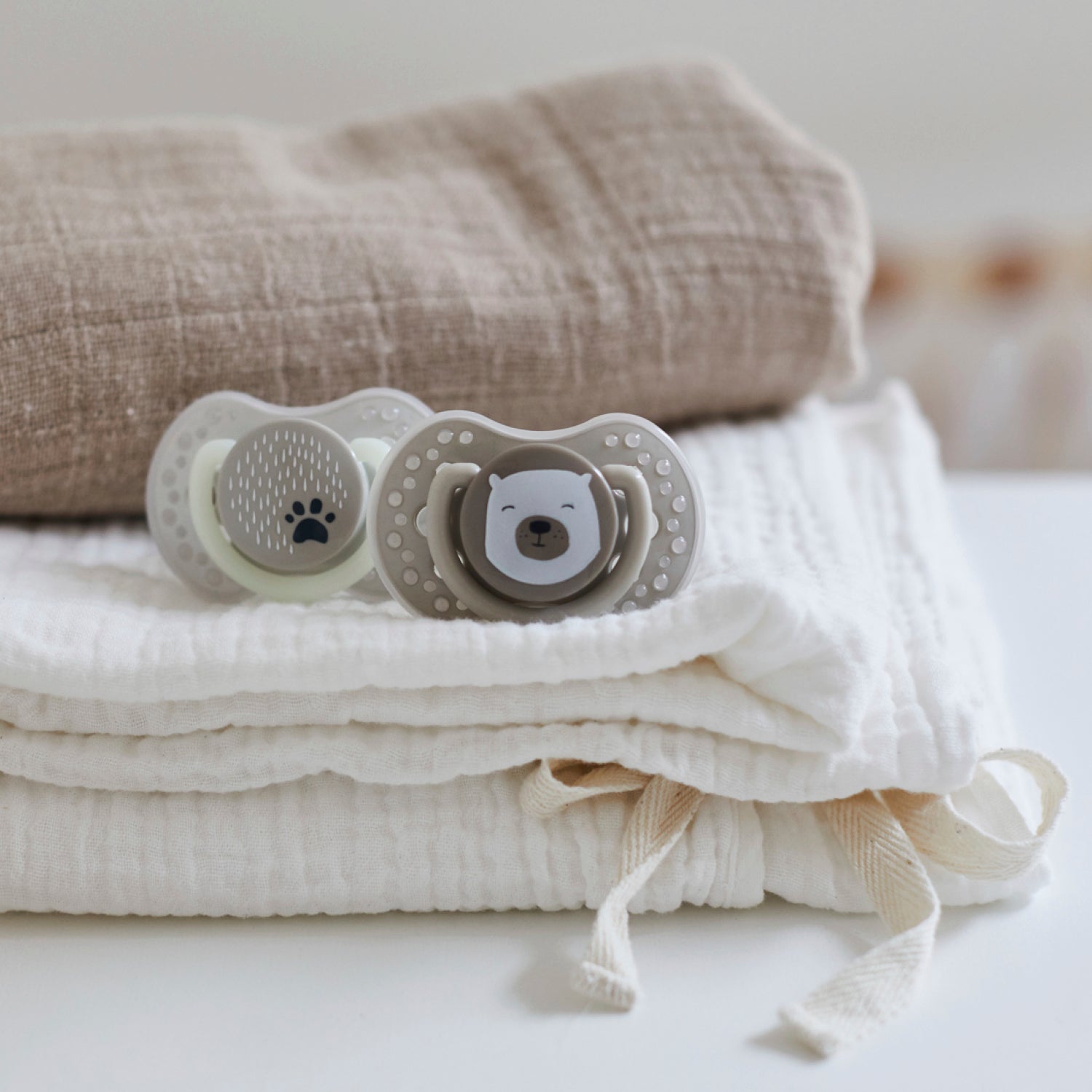 La principale différence réside dans l'apparence. Les sucettes Prime sont dotées d'un bouclier rond avec une découpe pour le nez, tandis que les fonctions restent les mêmes. Les deux collections sont conçues pour protéger le réflexe de succion de votre bébé et favoriser le développement de la parole et de la mastication. Les sucettes Prime sont conçues avec une base étroite et laissent le nez libre.
