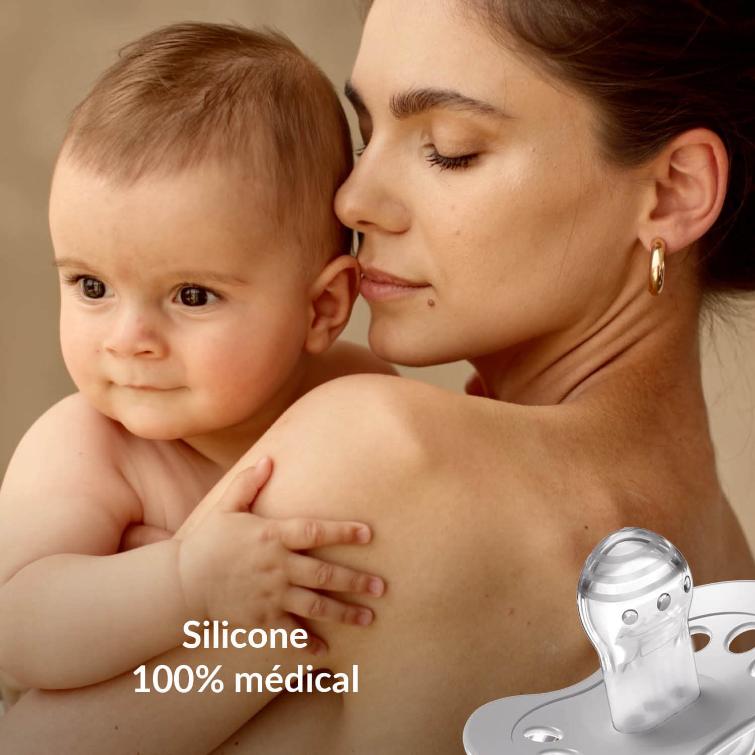 La tétine est composée de plusieurs couches de silicone durable. Grâce à sa conception flexible, elle se déplace au rythme de la succion de votre bébé.